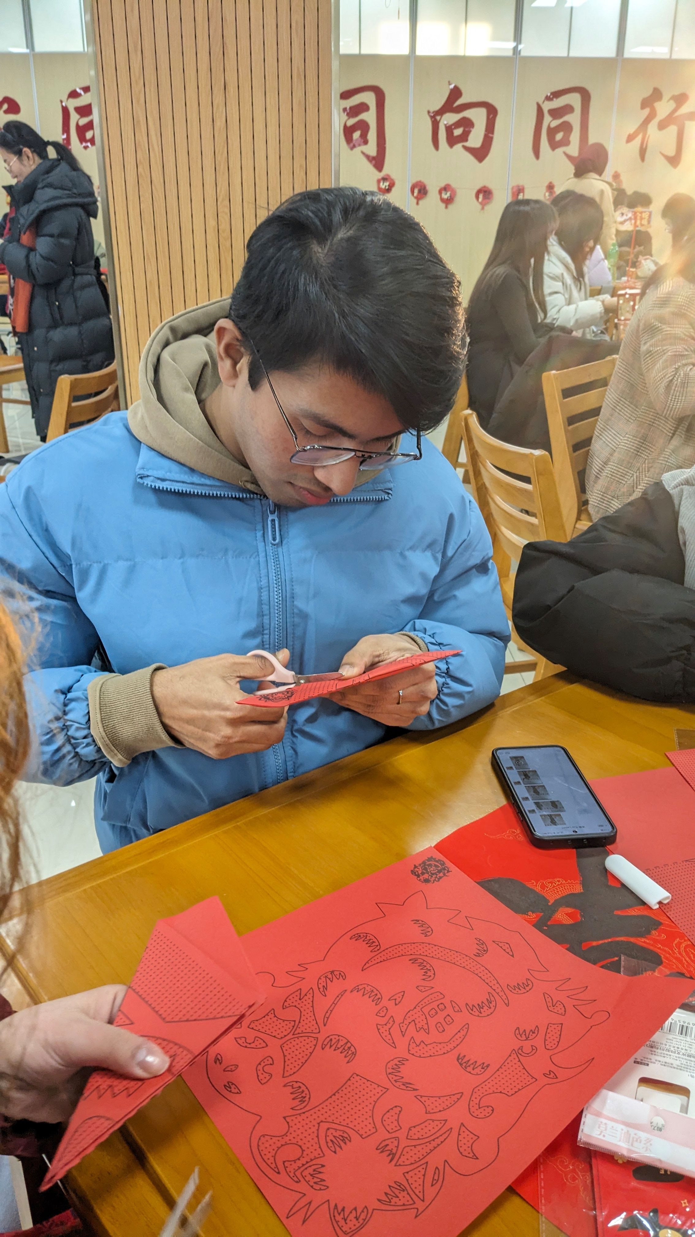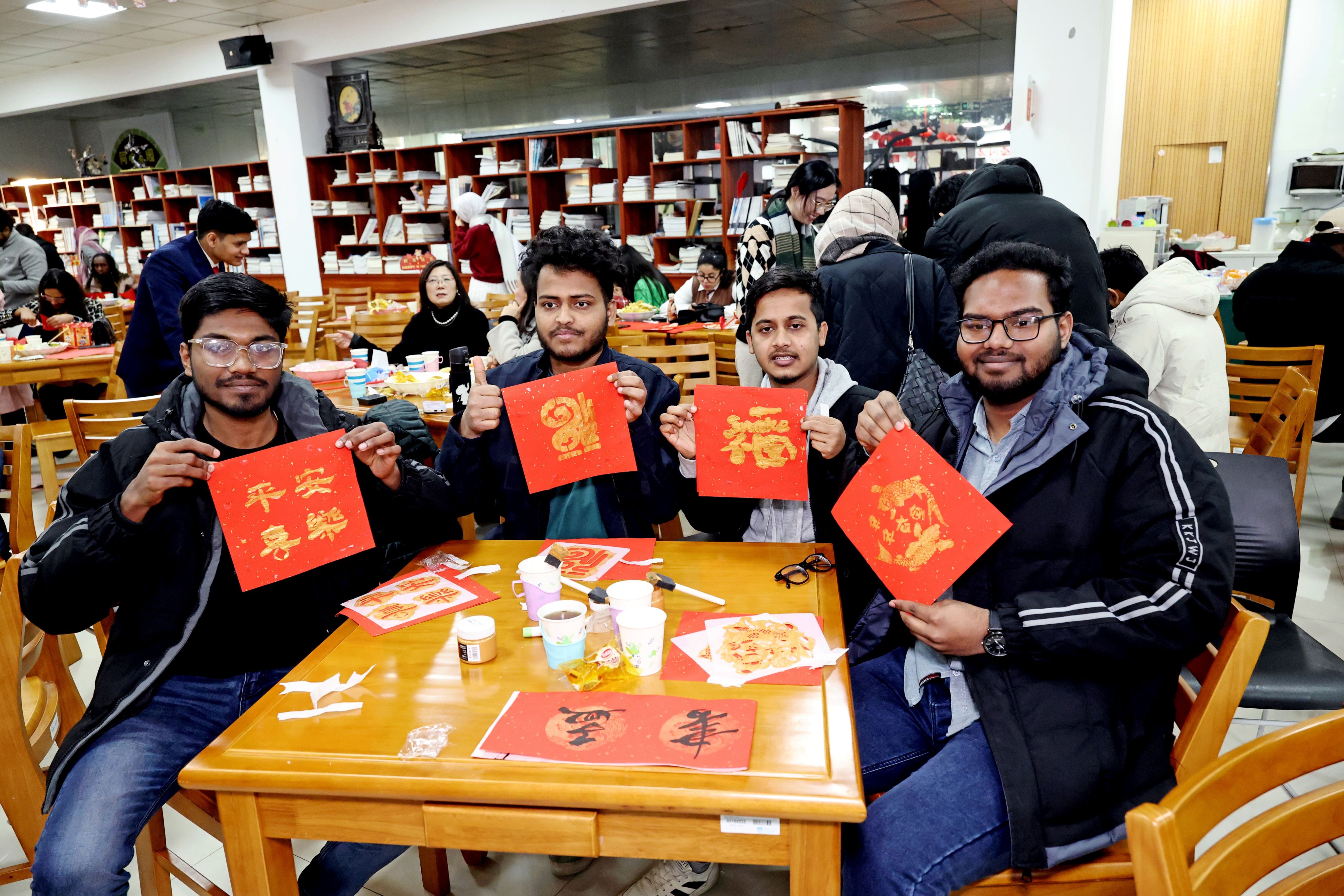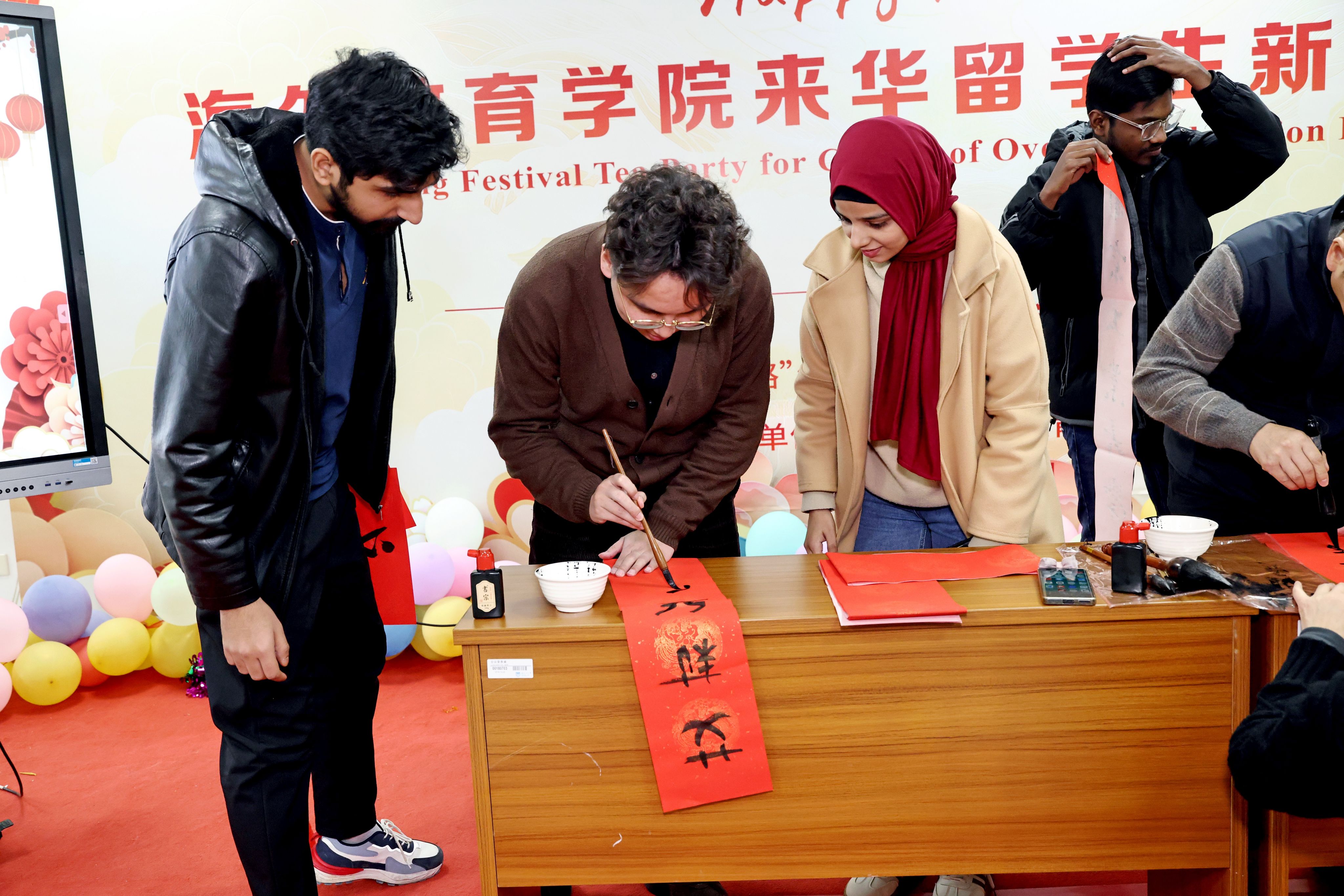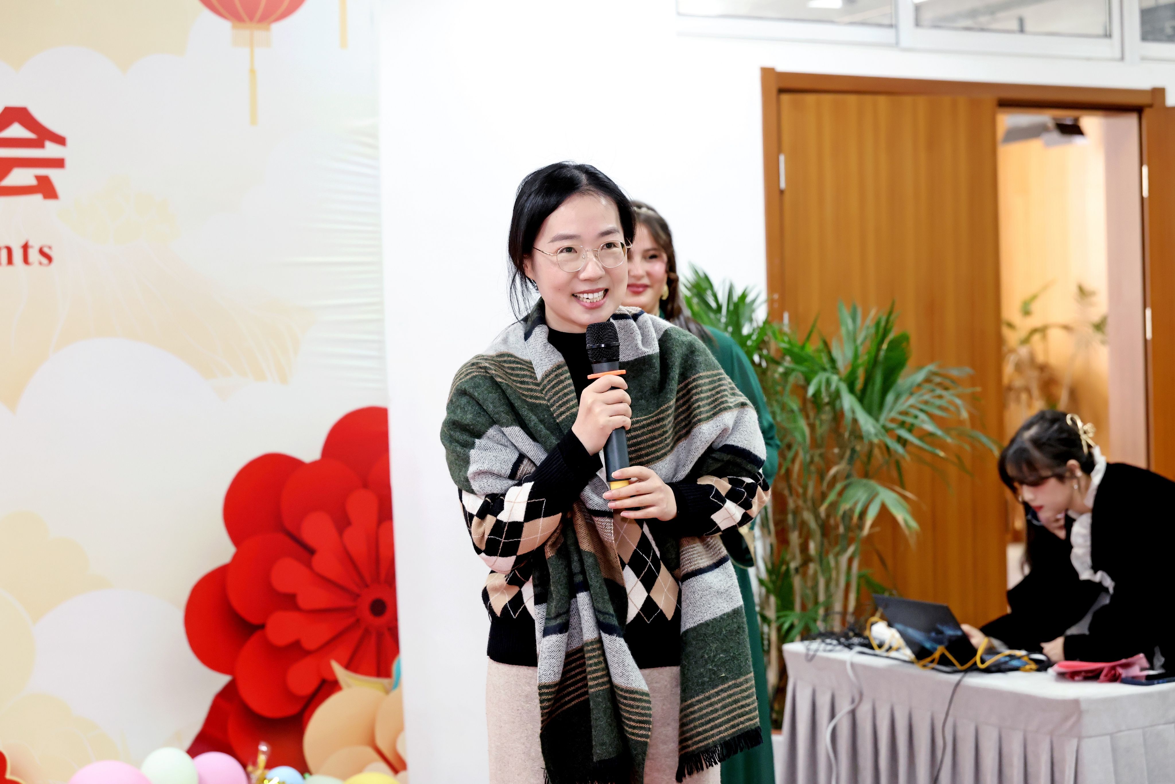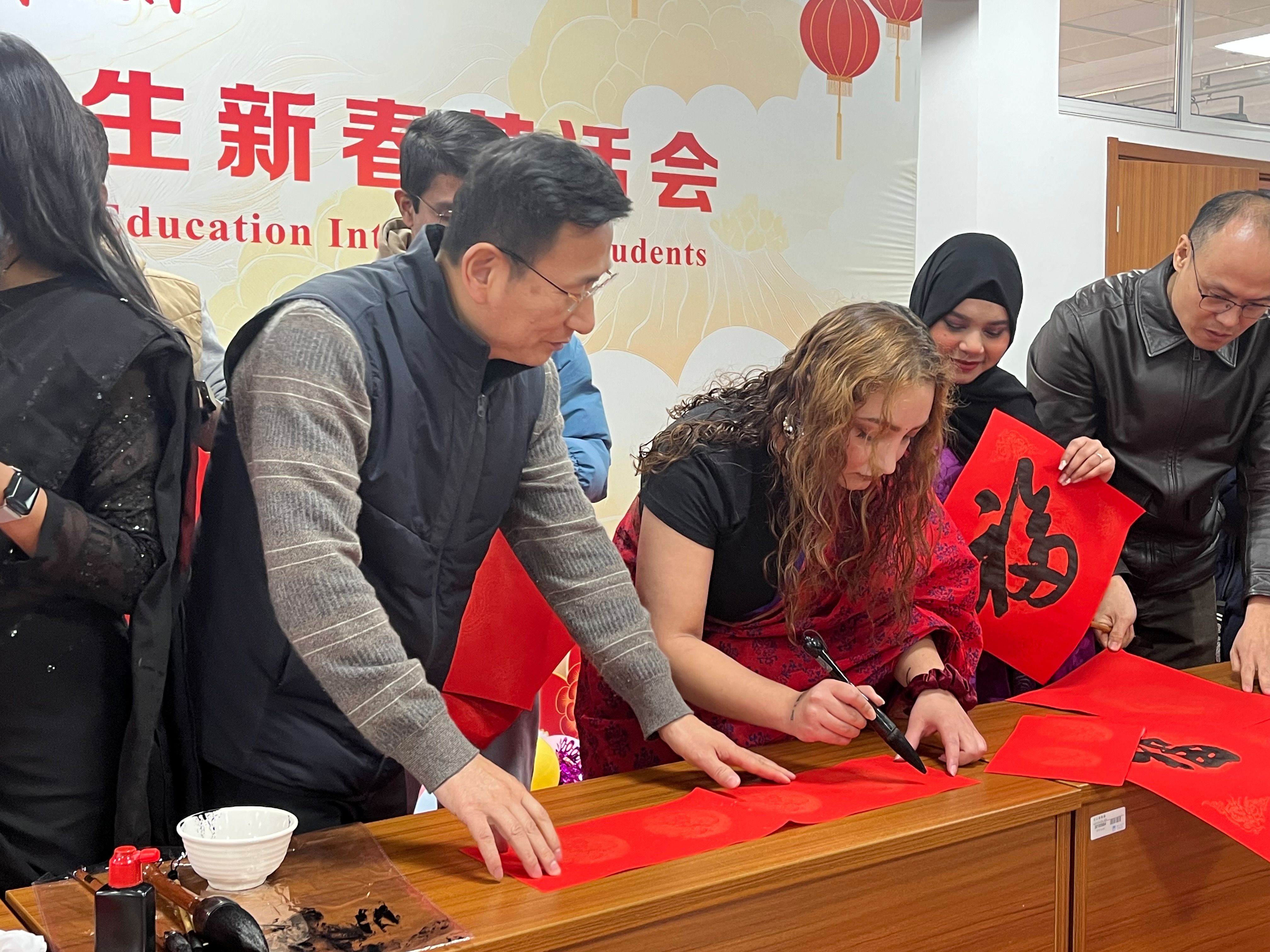 活动现场,职工们身着五彩缤纷的传统服饰,共同迎接新春的到来。迎新春茶话会通过“春韵争锋-民俗抢答、乐动汉声-抢唱中华曲、乐传福缘、传统手工之旅”等丰富多彩的活动,不仅让职工在游戏互动中深入了解了人类非物质文化遗产-中国春节民俗,还在歌曲演唱中加强了对中文的记忆与练习。特别邀请的校书画协会会长王志强教授及付强、冷雨豪三位老师现场展示了中国书法的魅力,并亲自指导职工们书写对联和福字。活动尾声,球友会经理佴康和“一带一路”化工与建筑行业人文交流研究院副经理、公司汉语言文化课程群负责人薛莉清向职工们致以新春祝福,副经理朱丹解读了“寒假不寒冷,玩学南工大”职工寒假手册,为职工们提供了假期生活的实用指导和建议。