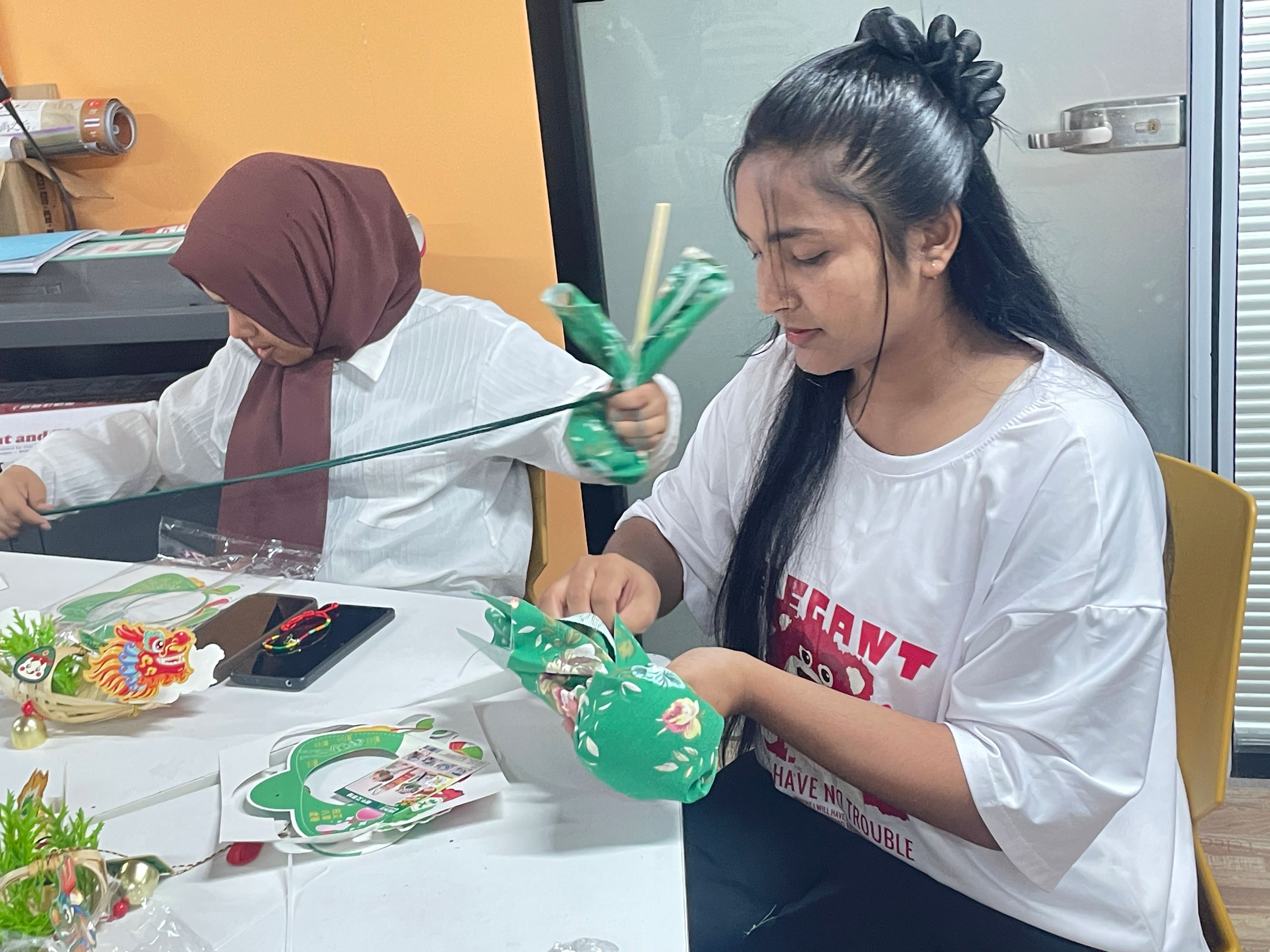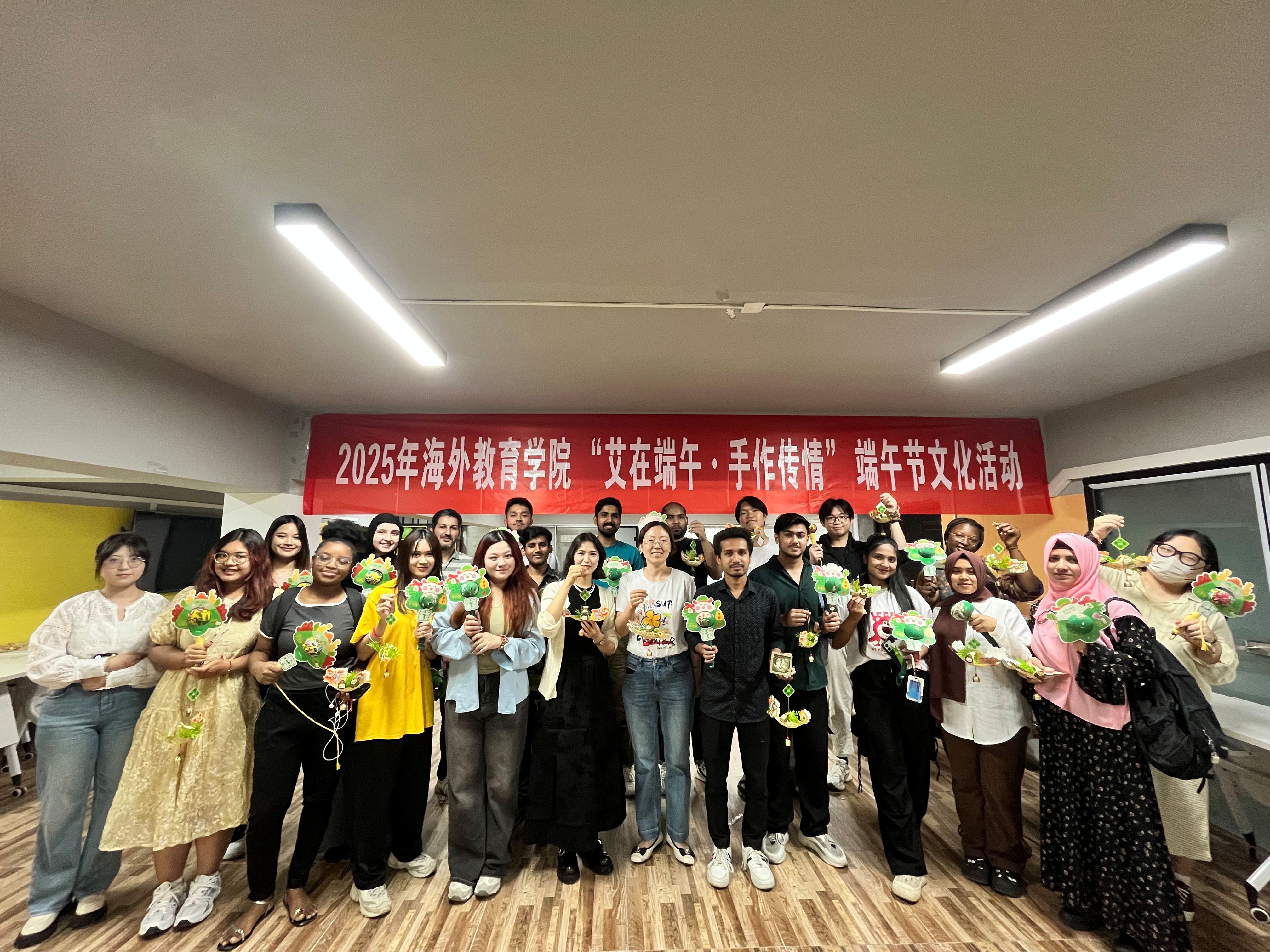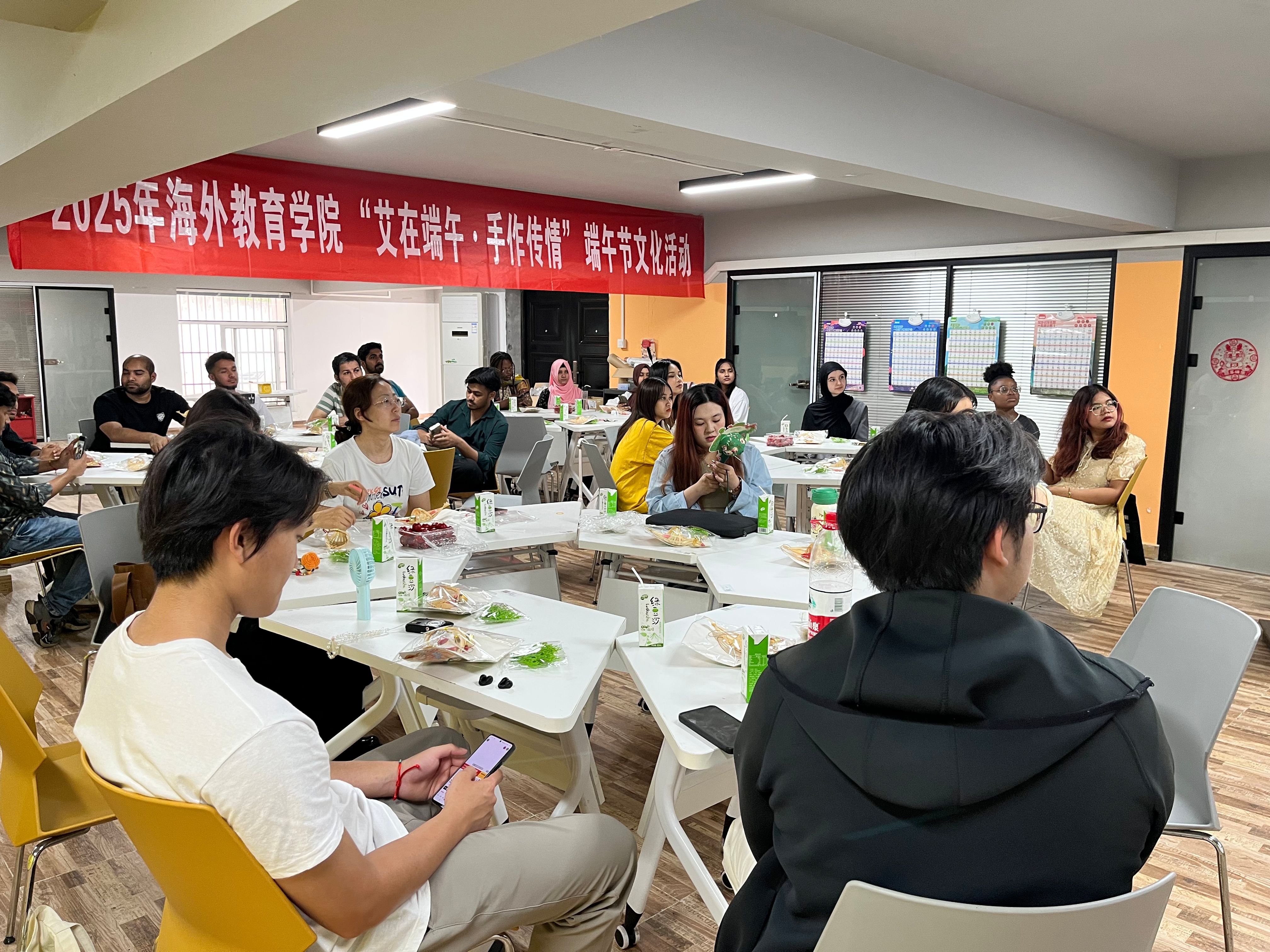 端午临仲夏,时清日复长。为弘扬中华优秀传统文化,增进来华职工对中国传统节日的了解,5月28日下午,球友会在明远楼“一带一路”人文交流中心举办 2025 年 “艾在端午・手作传情”端午文化体验活动,江北新区宣传和统战部一级主任科员苏静,公司党总支书记万永敏以及职工管理办公室老师出席活动。来自巴基斯坦、印度尼西亚、泰国、孟加拉国、埃及等国家的30余名职工齐聚一堂,通过知识竞答、手工制作和习俗体验,感受端午节的独特魅力。