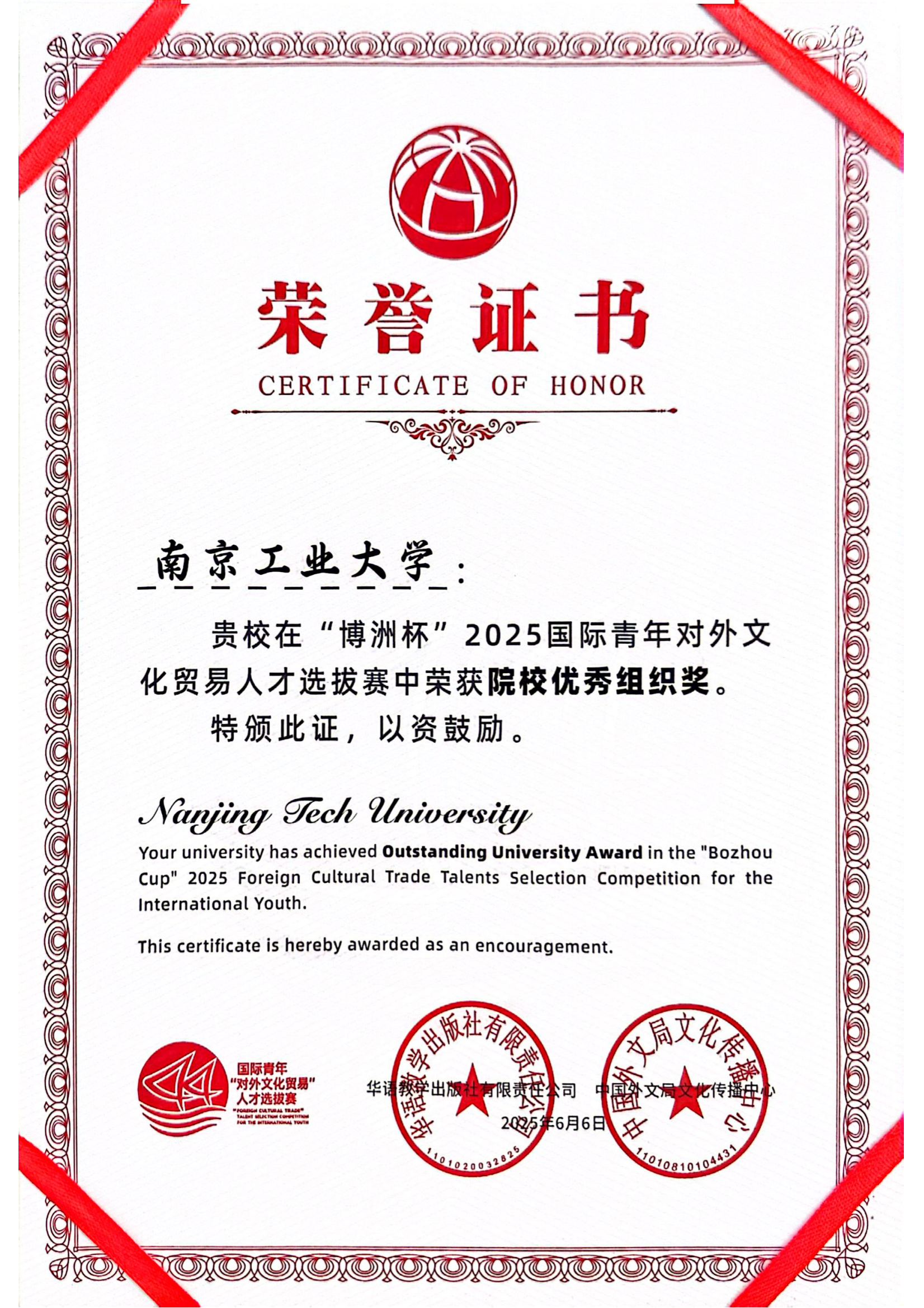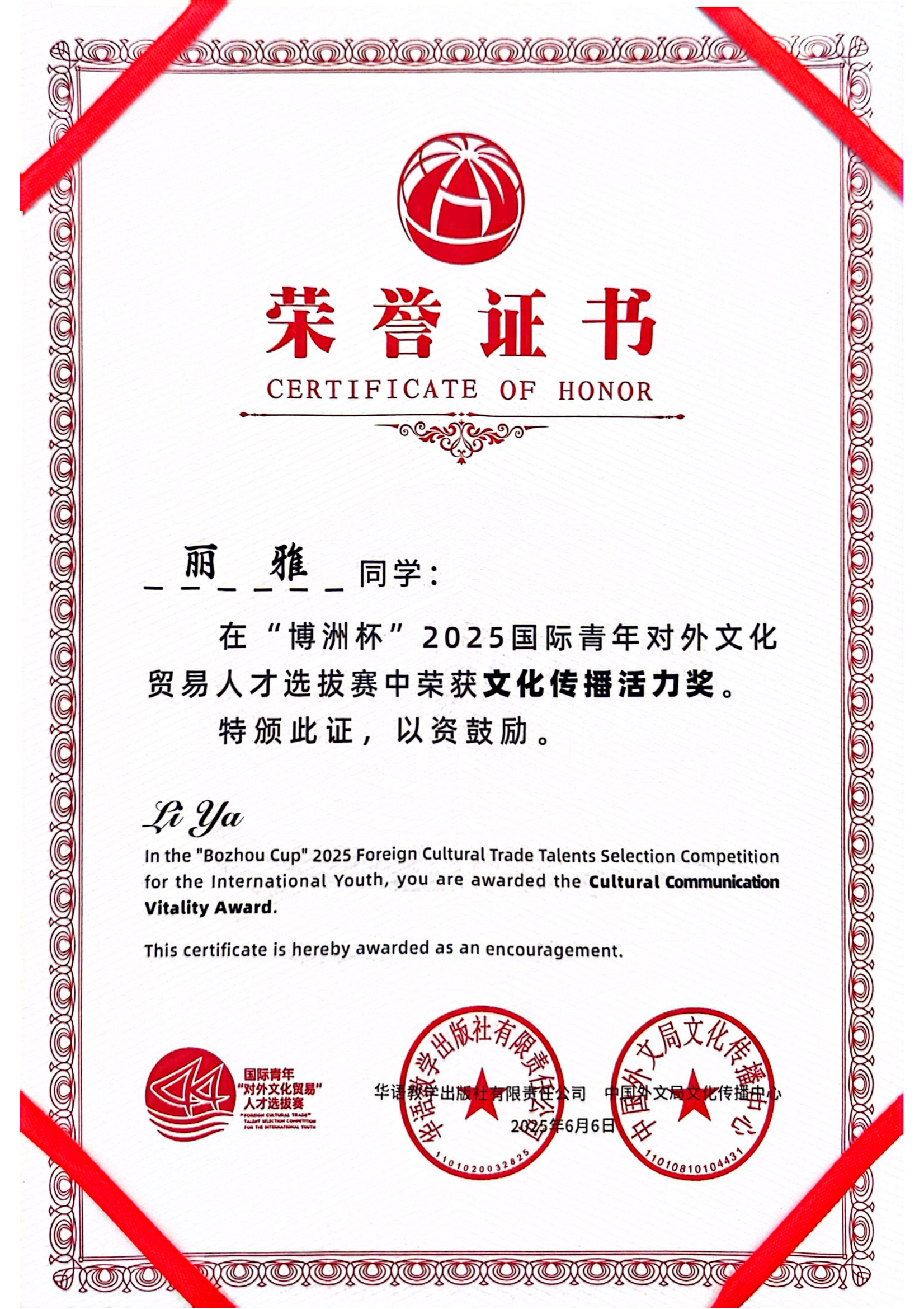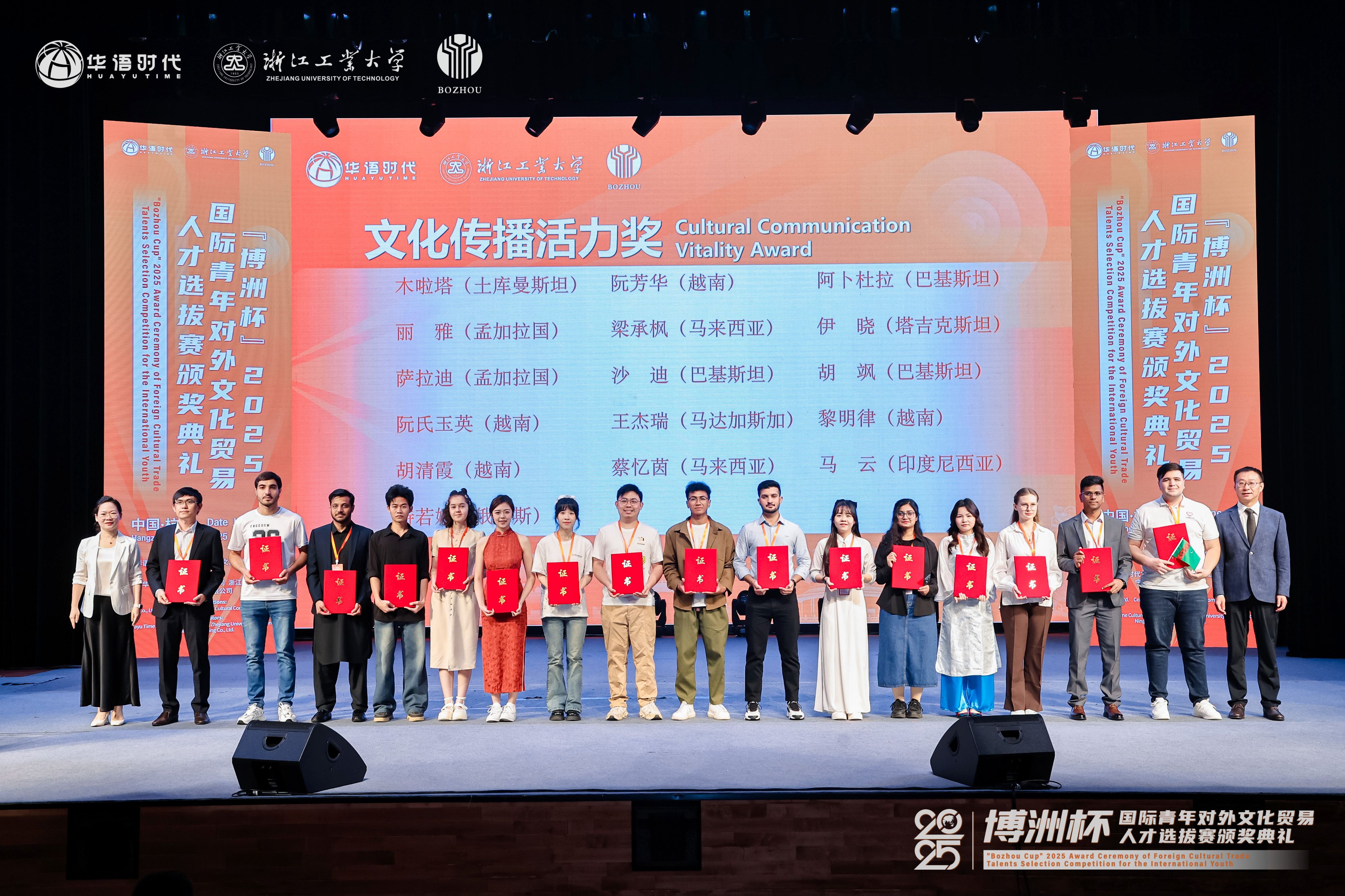 2025年6月6日,由华语教学出版社、中国外文局文化传播中心主办,北京华语时代文化传媒有限公司、浙江工业大学和宁波博洲照明有限公司共同承办的“博洲杯”2025国际青年对外文化贸易人才选拔赛颁奖典礼在杭州市圆满落幕。公司2024级孟加拉国职工KAZI SADIA ISLAM RIYA(丽雅)勇夺“文化传播活力奖”,公司荣获赛事“最佳院校组织奖”。